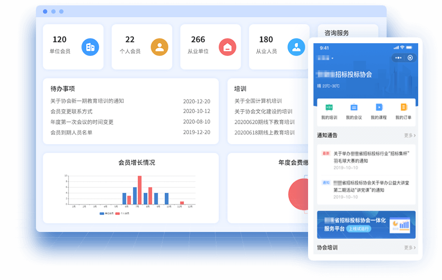 安訊協(xié)會一體化服務平臺,是按照“互聯(lián)網(wǎng)+社會組織”的理念,采用 “云計算、大數(shù)據(jù)”等先進信息技術,立足協(xié)會服務會員、規(guī)范市場秩序、開展行業(yè)自律等需求,建立的一體化管理與服務平臺,集成會員、從業(yè)人員、從業(yè)單位管理,通知、培訓、會議、咨詢、資源、直播服務,以及門戶網(wǎng)站、移動應用,實現(xiàn)協(xié)會各業(yè)務數(shù)字化整合,全面提升各方獲得感,為協(xié)會服務國家、社會、行業(yè)提供全面的信息化支撐。